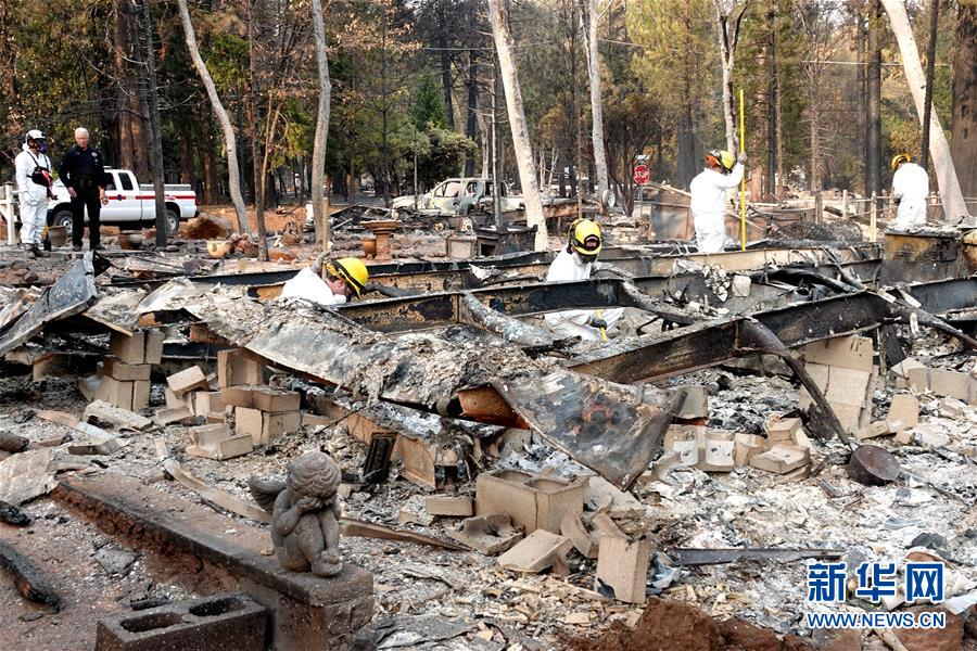 11月19日,在美國加利福尼亞州比尤特縣天堂鎮(zhèn),救援人員在山火廢墟中工作。新華社記者吳曉凌攝