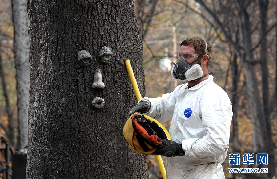 11月19日,在美國加利福尼亞州比尤特縣天堂鎮(zhèn),救援人員在山火廢墟中工作。新華社記者吳曉凌攝