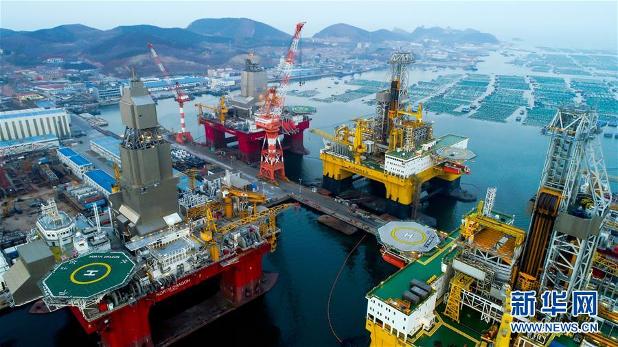 中集來福士海洋工程有限公司煙臺(tái)基地深水碼頭停放的半潛式鉆井平臺(tái)(11月14日無人機(jī)航拍)。新華社發(fā)(張丞攝)