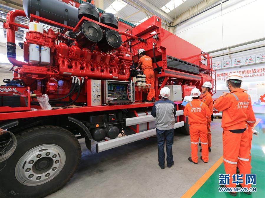 在杰瑞集團石油裝備制造工業(yè)園,工作人員在對壓裂車進(jìn)行裝配(10月17日攝)。新華社記者王南攝