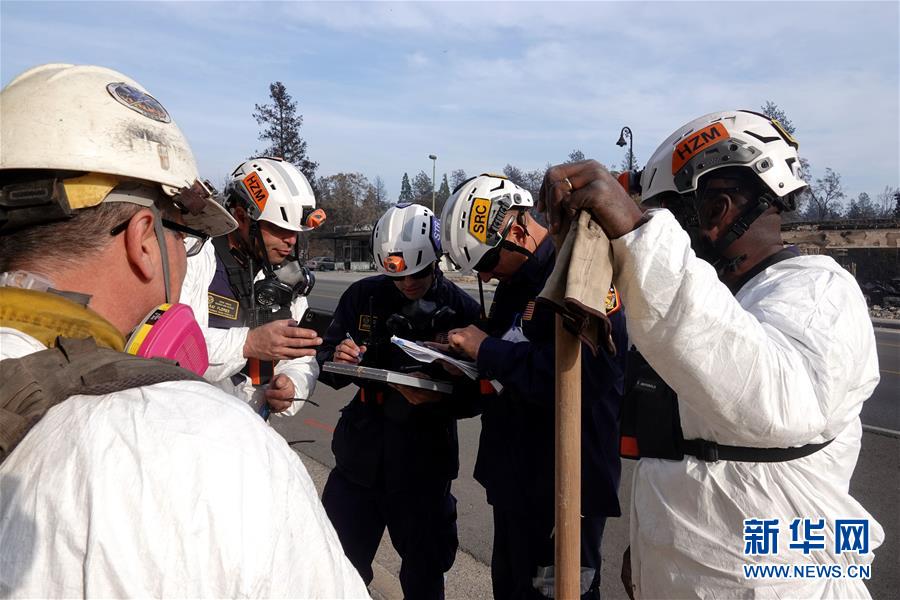 11月20日,在美國(guó)加利福尼亞州比尤特縣天堂鎮(zhèn),救援人員在災(zāi)區(qū)工作。