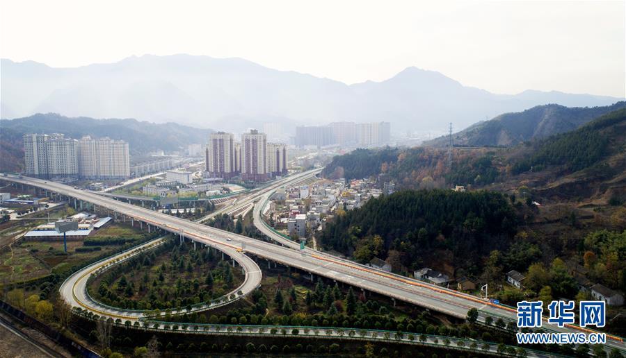 11月20日拍攝的水陽(yáng)高速公路與福銀高速公路相接的樞紐互通式立交(無(wú)人機(jī)拍攝)。 近日,記者從陜西省交通建設(shè)集團(tuán)公司了解到,陜西柞水至山陽(yáng)高速公路已全線貫通即將通車(chē)。據(jù)介紹,(柞)水(山)陽(yáng)高速公路全長(zhǎng)78.8公里,開(kāi)通后將實(shí)現(xiàn)包茂高速、福銀高速在陜南商洛地區(qū)的連接,開(kāi)辟出秦嶺南麓的一條橫向高速大通道,對(duì)完善陜西高速公路路網(wǎng)結(jié)構(gòu)、促進(jìn)陜南區(qū)域經(jīng)濟(jì)發(fā)展、加快山區(qū)群眾脫貧致富具有重要意義。 新華社記者劉瀟攝