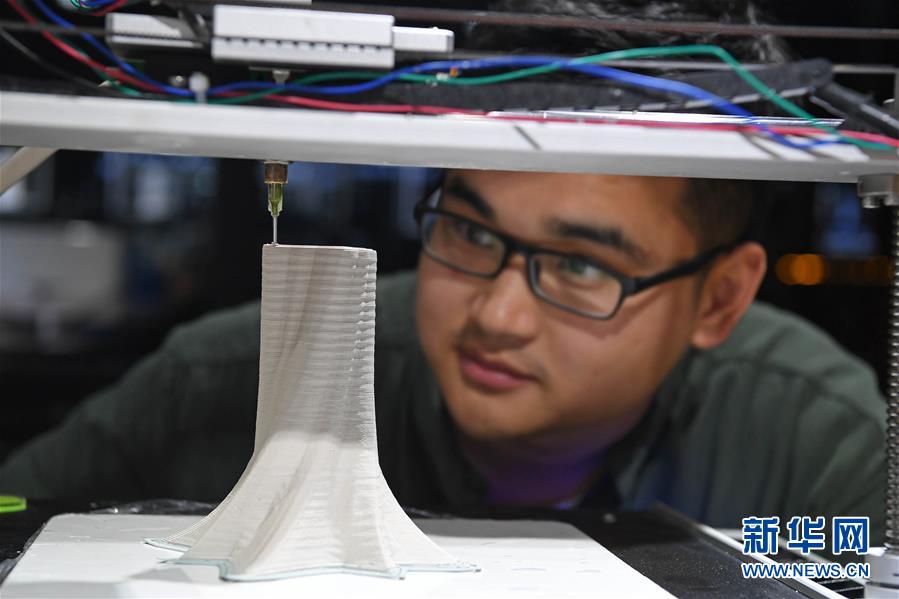 在江西景德鎮(zhèn)陶溪川文創(chuàng)街區(qū),一位工作人員正在用3D打印技術(shù)制作陶瓷花瓶(2017年4月8日攝)。 新華社記者 萬象 攝