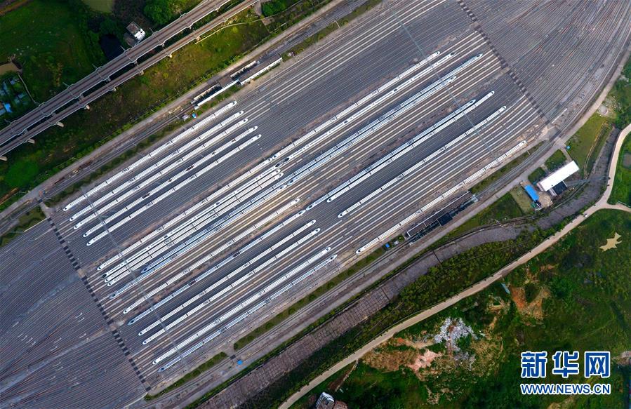 這是廣西南寧動車所內(nèi)準(zhǔn)備發(fā)往各地的動車組列車(6月18日無人機(jī)拍攝)。 廣西壯族自治區(qū)成立60年來,鐵路建設(shè)發(fā)生翻天覆地的變化。來自中國鐵路南寧局集團(tuán)有限公司的數(shù)據(jù)顯示,1958年廣西鐵路總里程為1346.3公里,如今廣西鐵路總里程達(dá)5191公里。廣西與周邊相鄰省份間實現(xiàn)動車“公交化”開行。此外,北部灣港—重慶班列、東盟海產(chǎn)品冷鏈班列、“百色一號”果蔬專列等的開通和運營,強(qiáng)化了鐵路供給的針對性和有效性。鐵路成為助推廣西經(jīng)濟(jì)社會快速發(fā)展的“大動脈”。 新華社記者黃孝邦攝