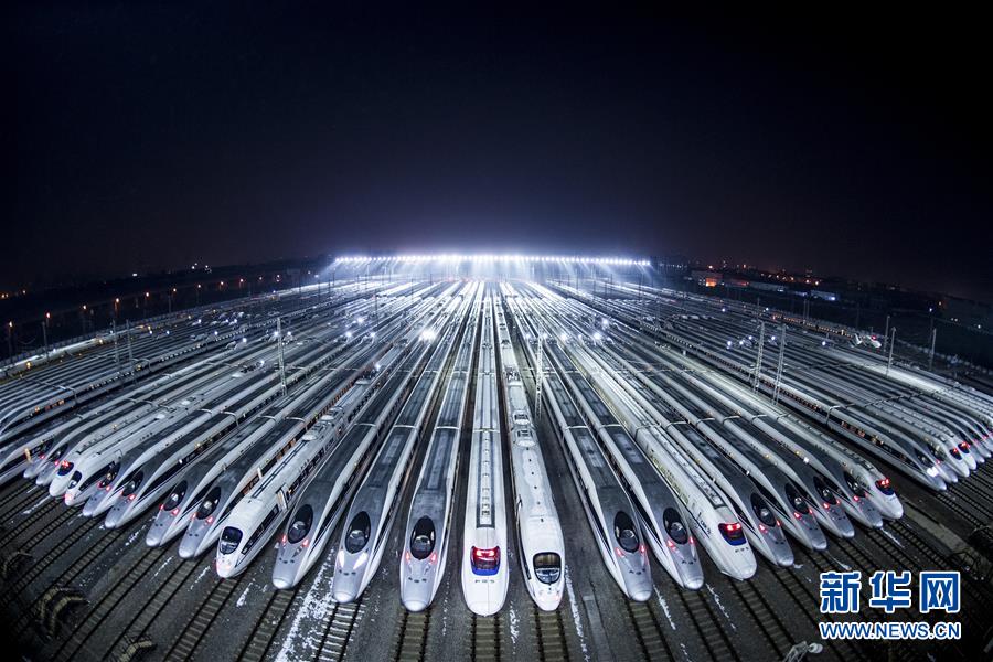 2018年2月1日凌晨,動車組停靠在武漢動車段的存車線上,準(zhǔn)備進(jìn)行檢修和保溫作業(yè)。近百組在武漢動車段經(jīng)過檢修、保溫作業(yè)的動車組蓄勢待發(fā),迎接春運。新華社記者 肖藝九 攝