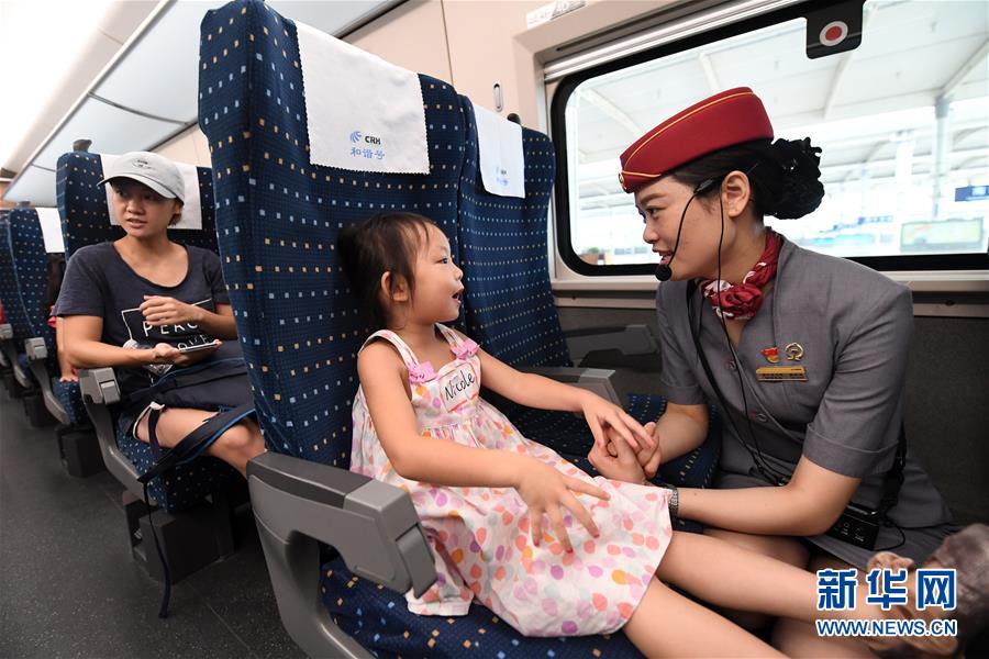 在南寧東站,一名列車工作人員在和一名小朋友交流(2017年8月5日攝)。 廣西壯族自治區(qū)成立60年來,鐵路建設(shè)發(fā)生翻天覆地的變化。來自中國鐵路南寧局集團(tuán)有限公司的數(shù)據(jù)顯示,1958年廣西鐵路總里程為1346.3公里,如今廣西鐵路總里程達(dá)5191公里。廣西與周邊相鄰省份間實現(xiàn)動車“公交化”開行。此外,北部灣港—重慶班列、東盟海產(chǎn)品冷鏈班列、“百色一號”果蔬專列等的開通和運營,強(qiáng)化了鐵路供給的針對性和有效性。鐵路成為助推廣西經(jīng)濟(jì)社會快速發(fā)展的“大動脈”。 新華社記者陸波岸攝