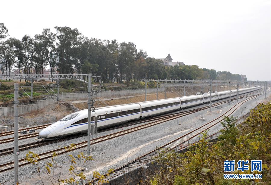 廣西桂林至北京高鐵列車在桂林市靈川縣境內(nèi)行駛(2013年12月28日攝)。 廣西壯族自治區(qū)成立60年來,鐵路建設(shè)發(fā)生翻天覆地的變化。來自中國鐵路南寧局集團(tuán)有限公司的數(shù)據(jù)顯示,1958年廣西鐵路總里程為1346.3公里,如今廣西鐵路總里程達(dá)5191公里。廣西與周邊相鄰省份間實現(xiàn)動車“公交化”開行。此外,北部灣港—重慶班列、東盟海產(chǎn)品冷鏈班列、“百色一號”果蔬專列等的開通和運營,強(qiáng)化了鐵路供給的針對性和有效性。鐵路成為助推廣西經(jīng)濟(jì)社會快速發(fā)展的“大動脈”。 新華社記者陸波岸攝