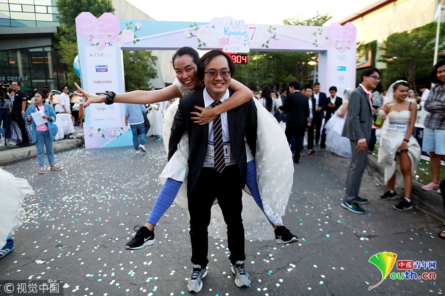 當(dāng)?shù)貢r(shí)間2018年11月24日,泰國曼谷舉辦新娘賽跑活動(dòng),獲勝者將獲得婚禮的全額資助,眾多新娘在街頭提裙狂奔。情侶沖過終點(diǎn)合影。
