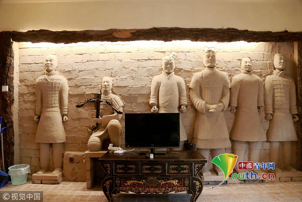 2018年11月27日,西安,民宿臥室內(nèi)的“兵馬俑”裝飾。近日,西安一家主打“兵馬俑”元素的民宿走紅,“兵馬俑”元素遍布在房間各個角落,“深情注視”著在此休憩的旅客,加上昏黃的燈光及復(fù)古的裝飾,讓不少旅客感嘆如同居住在“秦始皇陵”。 張遠(yuǎn)(陜西分社)/視覺中國