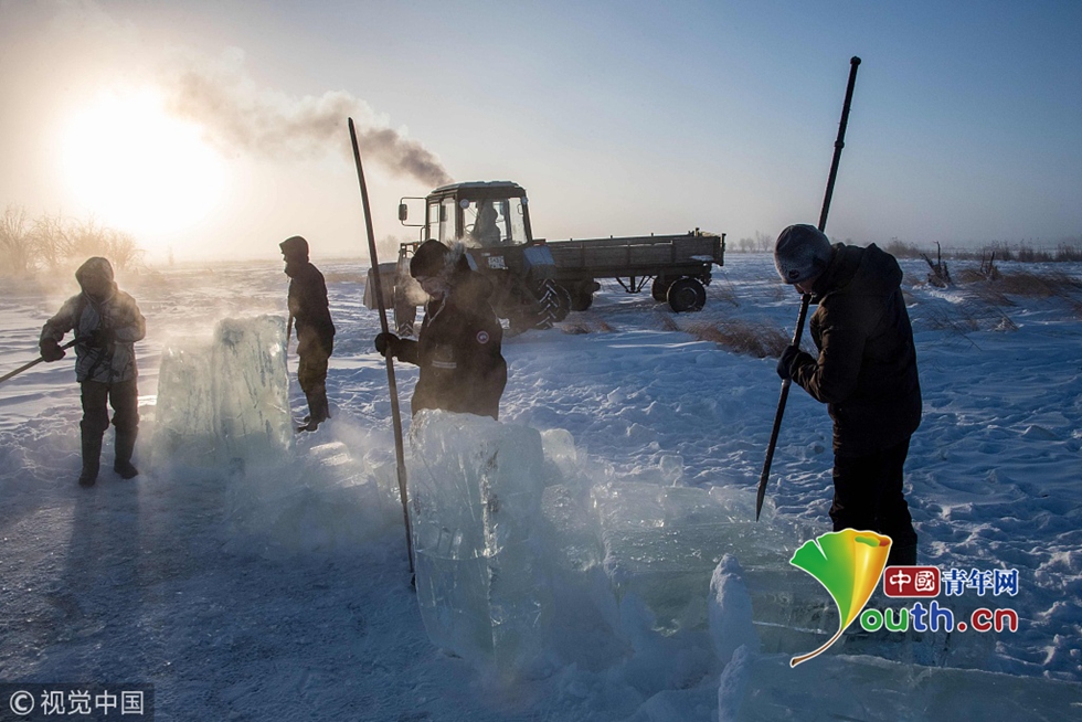 當(dāng)?shù)貢r(shí)間2018年11月27日,雅庫茨克,零下41攝氏度左右的氣溫下,村民在當(dāng)?shù)氐囊粋€(gè)湖中采集冰塊。當(dāng)?shù)睾芏嗳艘蕾囉谌诨鶋K解決供水,因?yàn)槎嗄陜鐾粮采w地區(qū)冬季氣溫極低,沒有其他的方式供應(yīng)水。