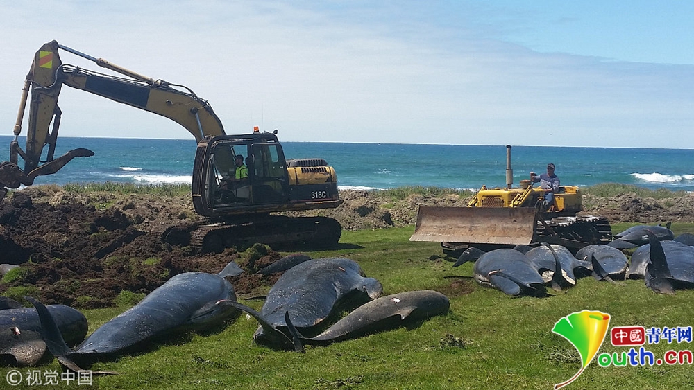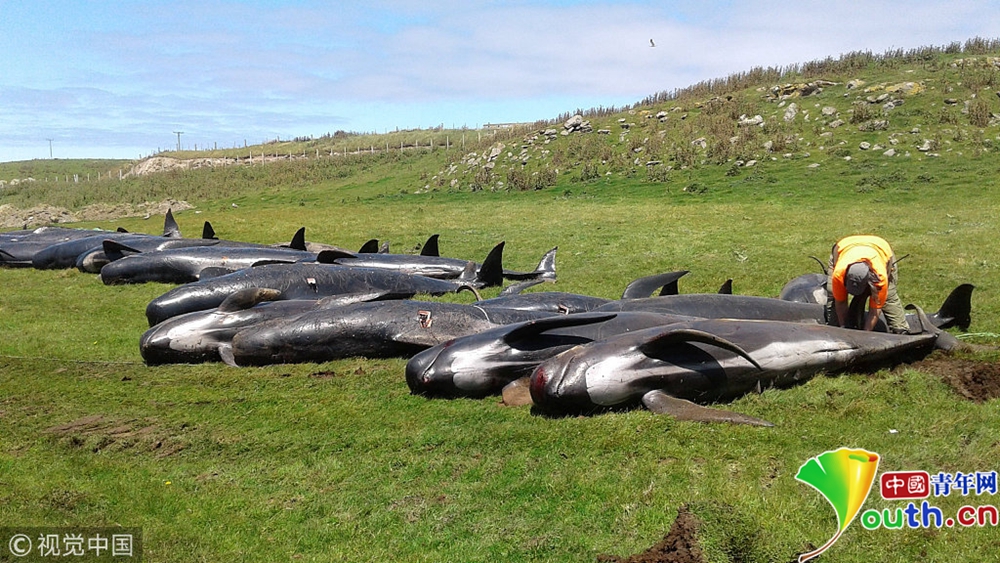 當地時間11月30日,新西蘭查塔姆島,多頭巨頭鯨在當地海灘擱淺死亡,尸體被沖上岸。