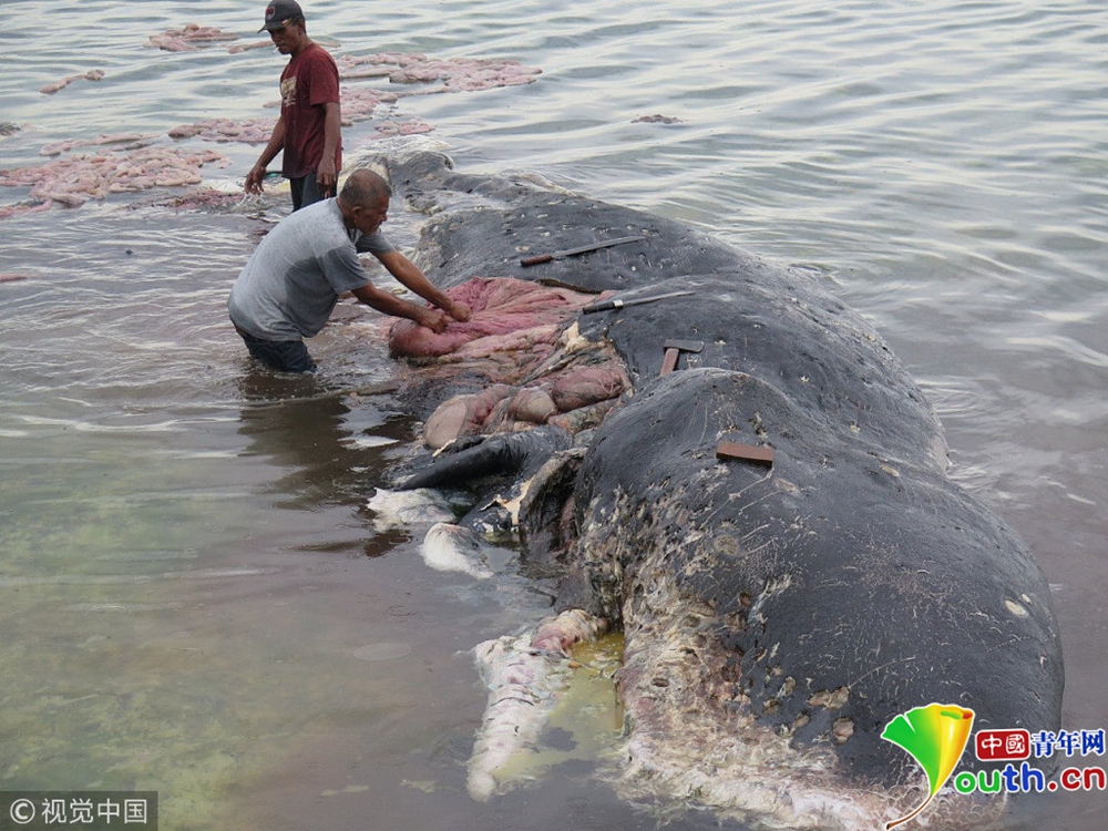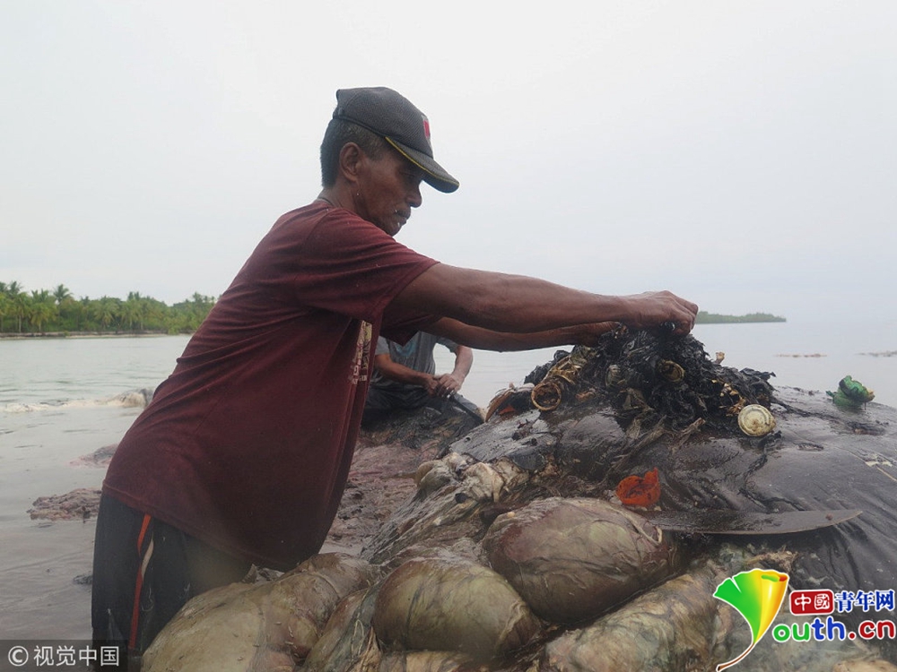 當地時間2018年11月19日,印尼瓦卡托比,當地發(fā)現一頭擱淺的鯨,肚子里滿是塑料垃圾。它的腹中有12斤塑料垃圾,其中包括115個杯子。