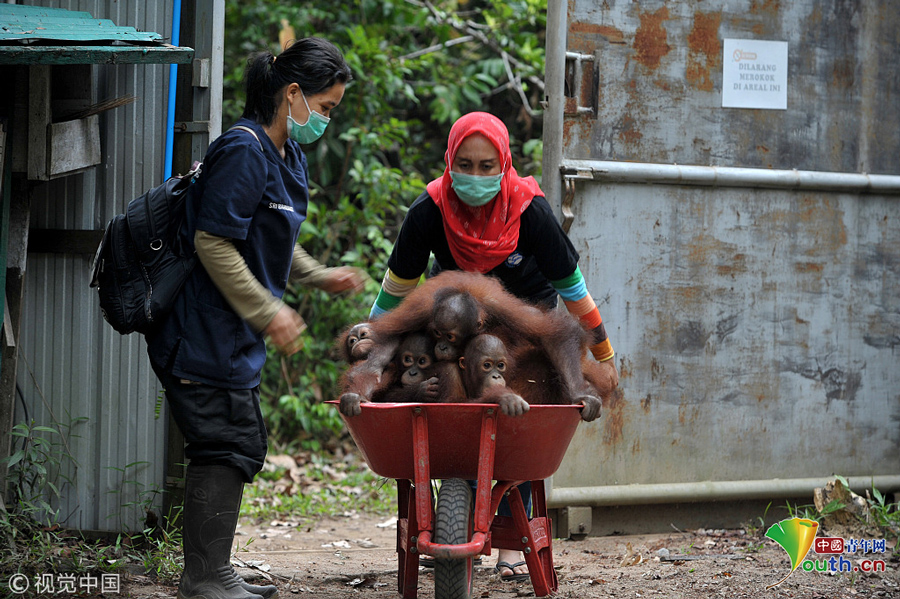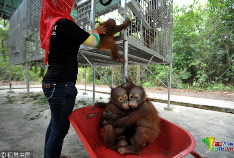 當地時間2018年9月18日,印尼加里曼丹克塔邦,國際動物救援(IAR)猩猩安全與保護中心里,飼養(yǎng)員用獨輪車把猩猩寶寶送到森林學校。圖片作者:Newscom