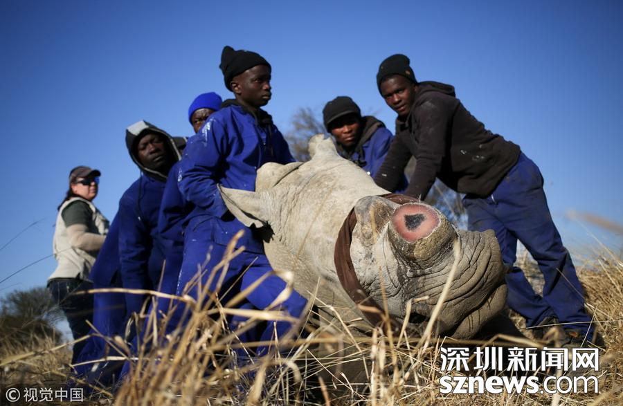 當地時間2017年8月14日,南非西北省,一名工作人員在為一頭犀牛鋸角,這是一種保護犀牛的行為,可以防止它們喪命于偷獵者的槍口下。
