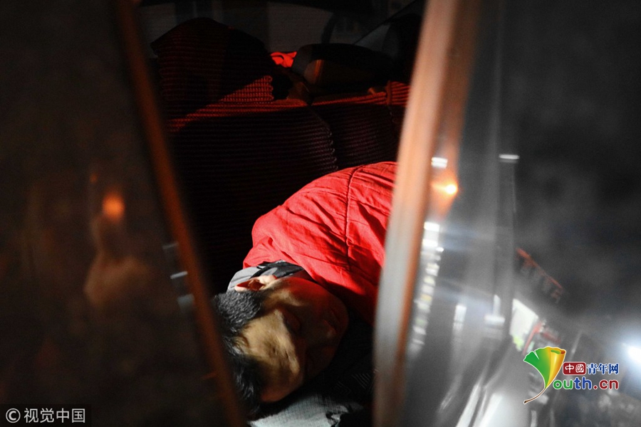 2018年11月17日,北京,由于醫(yī)院只允許一名家長(zhǎng)陪護(hù),醫(yī)院門(mén)口的日租房又很貴,袁東方不舍得花錢(qián),只好借住在病友的車(chē)內(nèi)。魏建順/視覺(jué)中國(guó)