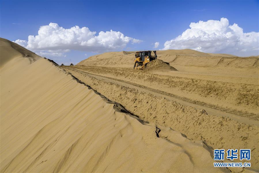 這是建設(shè)中的新疆且末縣至尉犁縣的沙漠公路(7月5日攝)。新華社記者 胡虎虎 攝