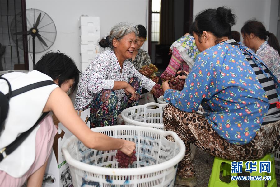 下姜村村民將剛采摘的葡萄挑揀裝箱(2017年8月9日攝)。下姜村用流轉的土地建成葡萄園、草莓園、茶葉園、中藥材園等產業(yè)園區(qū),村民收入實現(xiàn)了“節(jié)節(jié)高”。