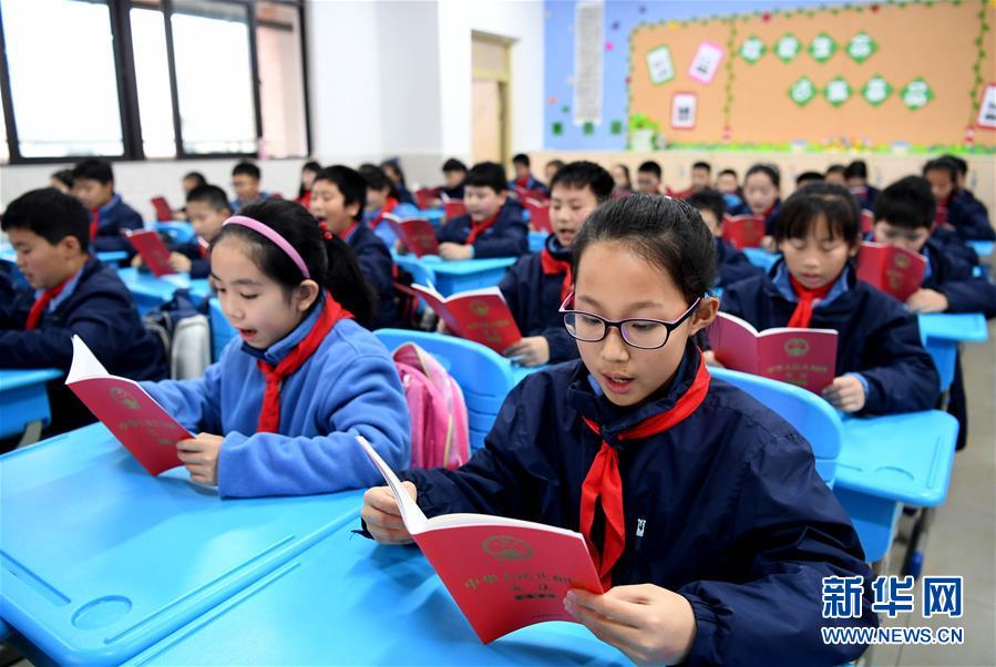 12月3日,合肥市朝霞小學(xué)的學(xué)生們?cè)谡b讀憲法。國(guó)家憲法日到來之際,各地學(xué)校紛紛舉辦主題宣講活動(dòng),對(duì)學(xué)生開展法治教育,幫助孩子們了解憲法知識(shí)。新華社記者 劉軍喜 攝