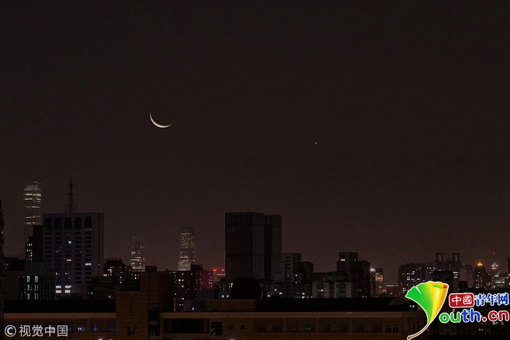 北京,天宇上演“金星合月”,清晨5點(diǎn)時(shí),東南方低空出現(xiàn)一顆明亮的金星和一彎窄月近距離相依相伴的美麗畫(huà)面。