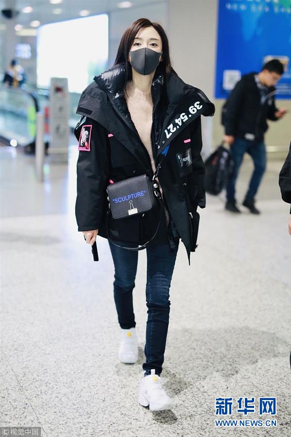 2018年12月3日,上海,秦嵐亮相機場。潮味棉服亮相機場變酷女孩,口罩遮面露甜笑心情靚。(圖片來源:視覺中國)