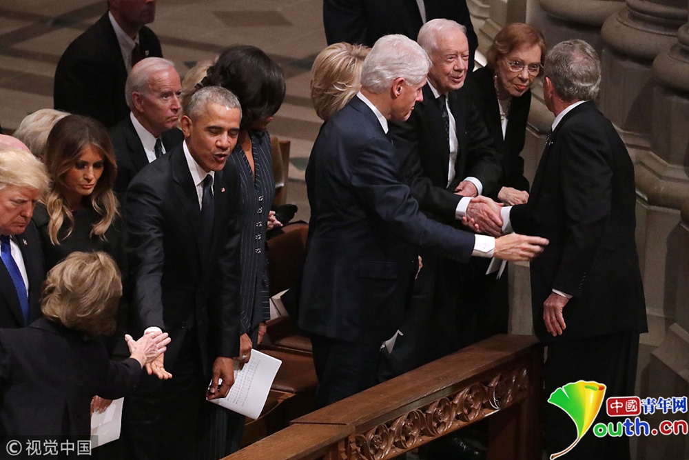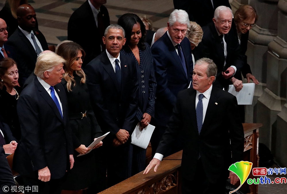 布什家族成員、現(xiàn)任總統(tǒng)特朗普、前總統(tǒng)奧巴馬等美國政界人士以及多名國際政要出席,為老布什送行。