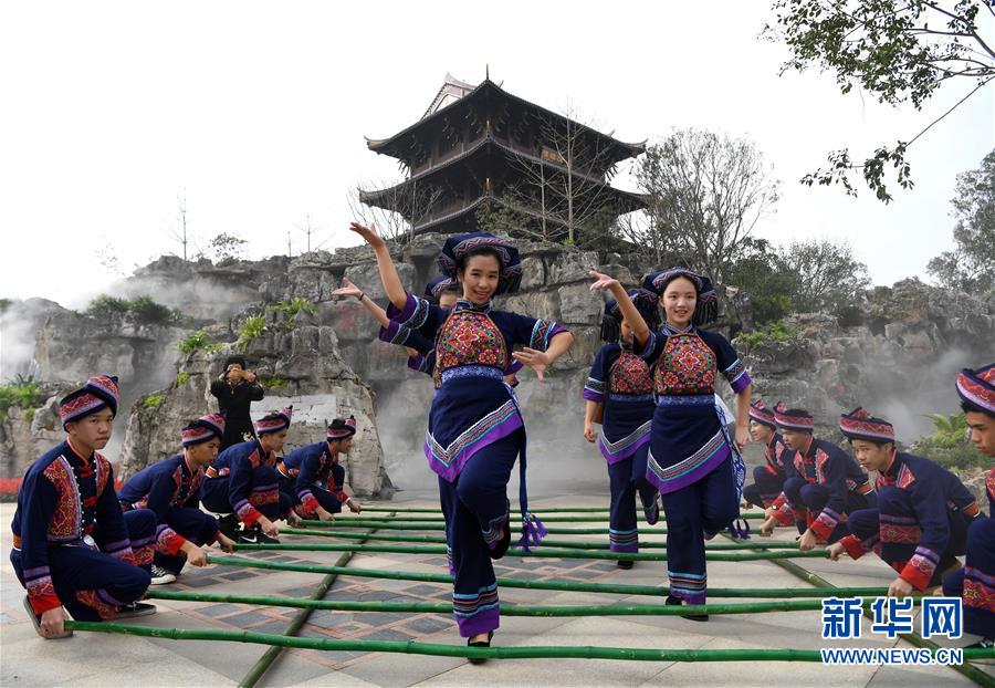 12月6日,演員在第十二屆中國(南寧)國際園林博覽會(huì)八桂天境園(廣西園)前跳竹杠舞。 新華社記者 周華 攝
