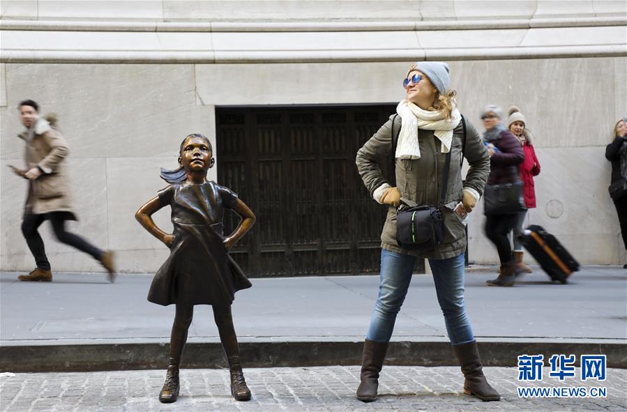 12月10日,在美國(guó)紐約,一名女士與紐約證券交易所前的“無畏女孩”銅像合影。 新華社記者 王迎 攝