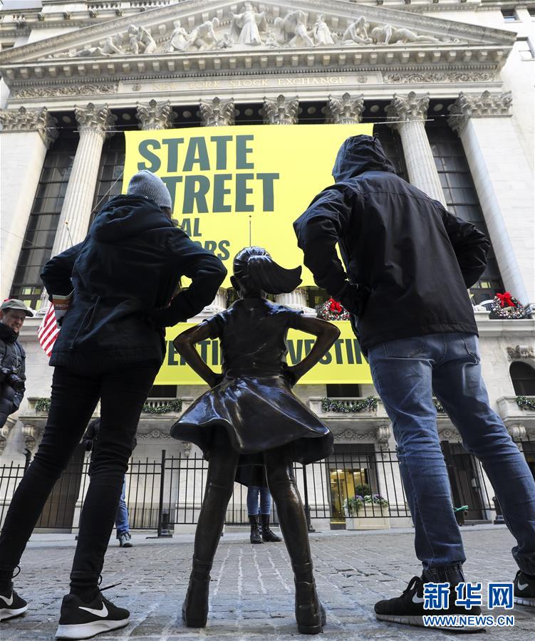 12月10日,在美國紐約,人們與紐約證券交易所前的“無畏女孩”銅像合影。 新華社記者 王迎 攝