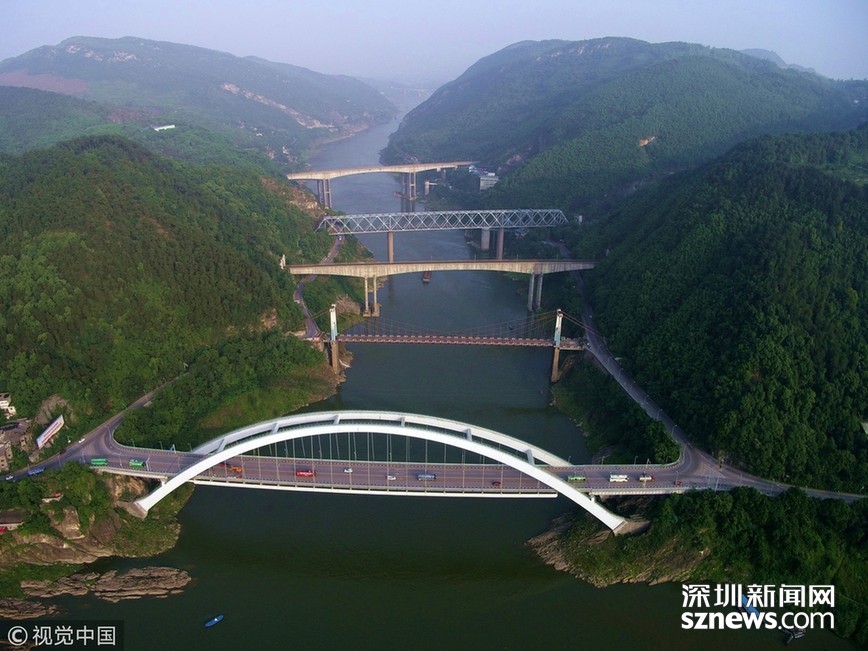 畫(huà)面中由近及遠(yuǎn)分別是新朝陽(yáng)橋、老朝陽(yáng)橋、遂渝鐵路橋、襄渝鐵路橋、蘭渝鐵路橋。