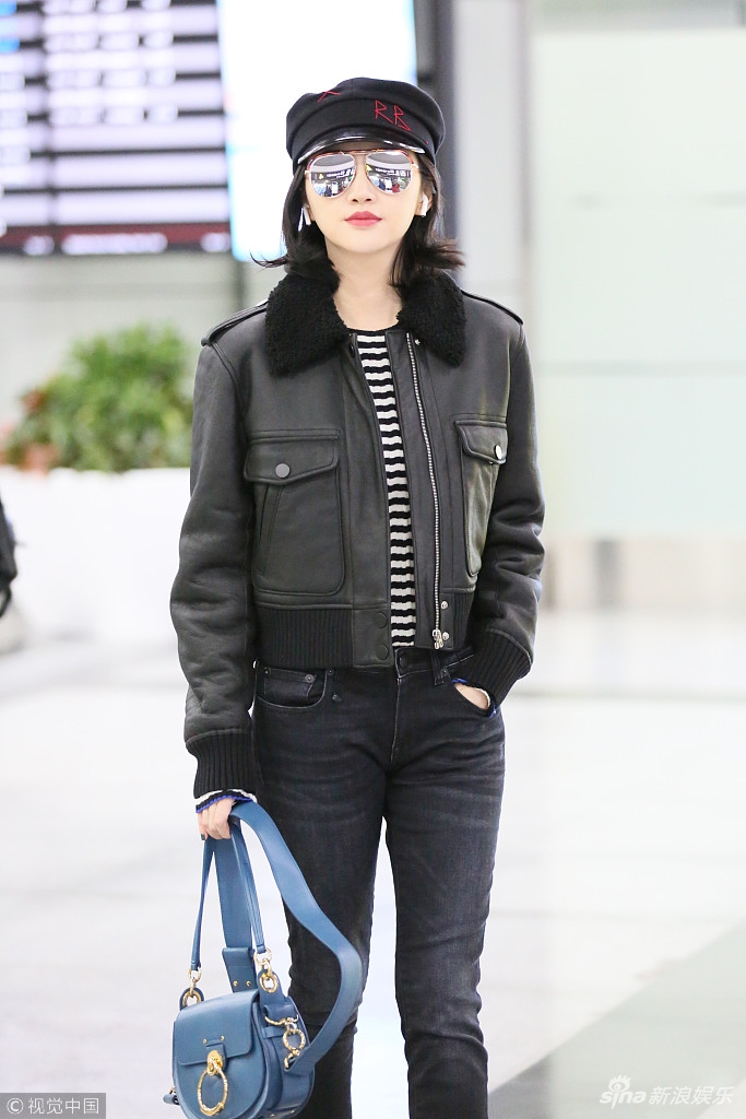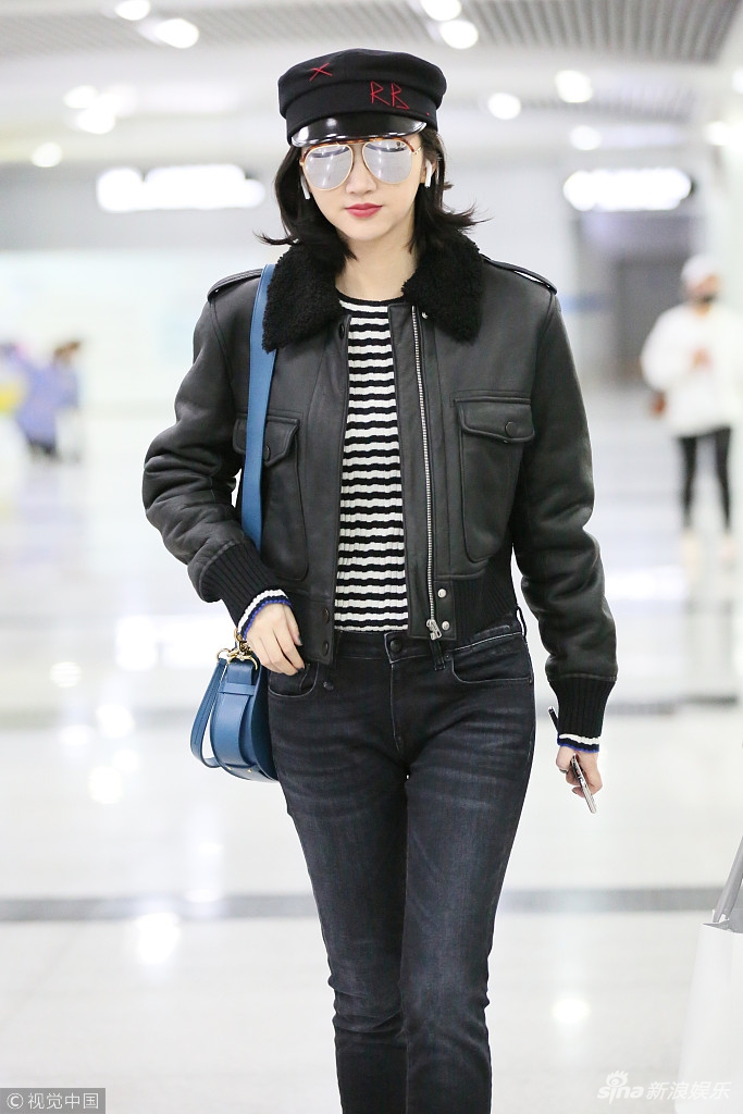 日前,景甜現(xiàn)身機場,身穿黑色皮夾克超有范兒,戴小帽酷似甜美女軍官。視覺中國/圖