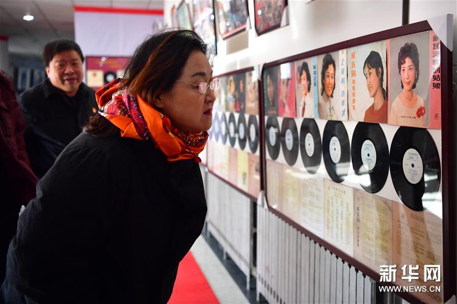 12月12日,觀眾在洛陽(yáng)隋唐百戲城觀看展出的電影海報(bào)與老唱片。新華社記者馮大鵬攝