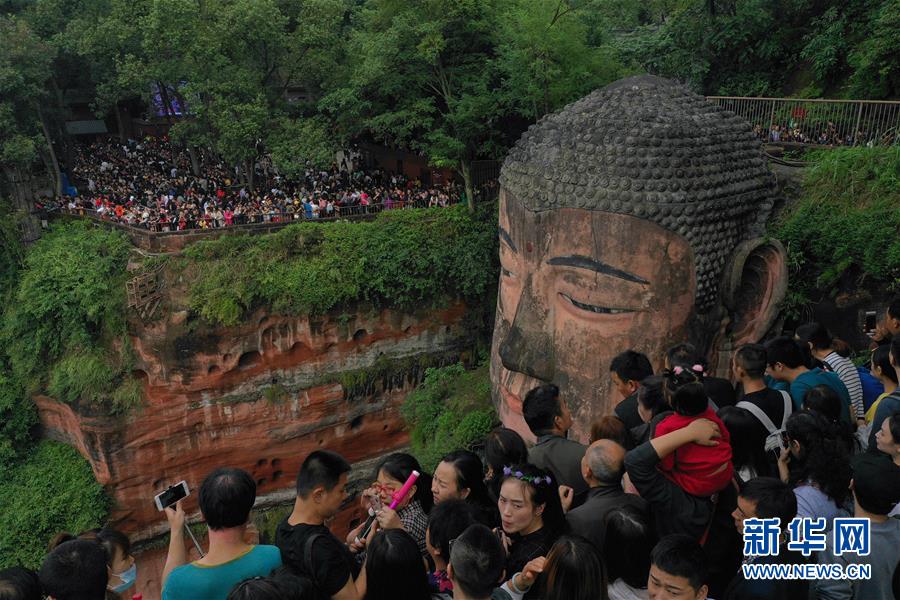 10月4日,游客在樂山大佛前排隊一睹大佛真容(無人機(jī)拍攝)?!⌒氯A社記者 江宏景 攝
