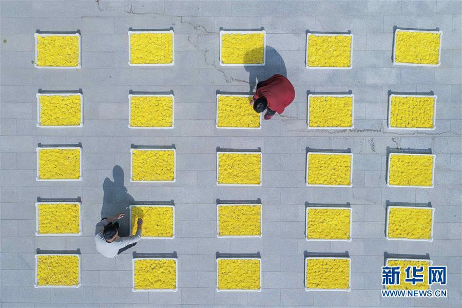 2018年11月7日,河北省魏縣魏城鎮(zhèn)町上村農(nóng)民在分揀晾曬菊花。 大地之色,俯仰之間;壯美山河,是我的祖國。2018年,新華社記者操縱無人機“飛閱”華夏大地,在最美的時節(jié),定格下她的色彩斑斕。 新華社記者 朱旭東 攝