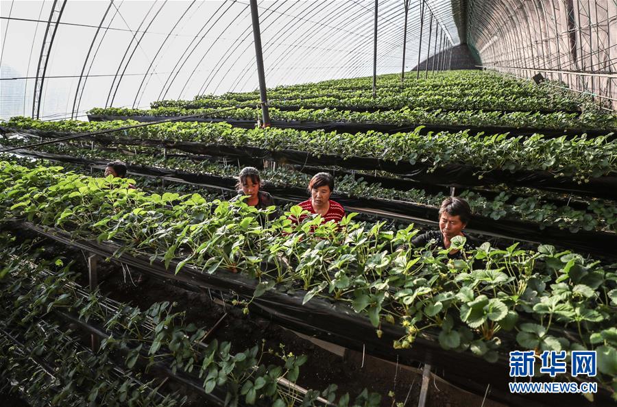 12月19日,農(nóng)戶在大棚里管理草莓。 2017年5月,遼寧省鐵嶺市昌圖縣大四家子鎮(zhèn)方家船口村利用土地確權(quán)成果,由村兩委班子成員領(lǐng)辦創(chuàng)辦了昌圖久晟果木蔬菜種植專業(yè)合作社。到2018年9月,合作社利用產(chǎn)業(yè)扶貧資金、壯大村集體經(jīng)濟(jì)扶持資金、村集體用地和村民入股資金建成了11個(gè)“股份制大棚”,主要種植草莓等作物,產(chǎn)品通過(guò)電商銷往云南、四川、北京、上海等地,預(yù)計(jì)第一期可為265名貧困戶每人分紅860元。 新華社記者潘昱龍攝