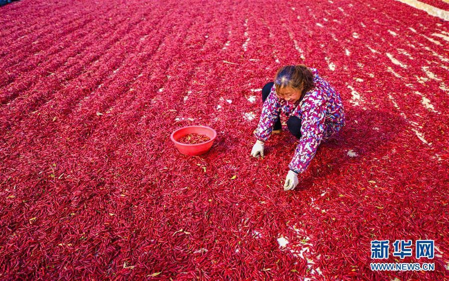 11月18日,在衡水市冀州區(qū)周村鎮(zhèn)辣椒加工交易基地,椒農(nóng)在對摘好的辣椒進(jìn)行二次篩選。