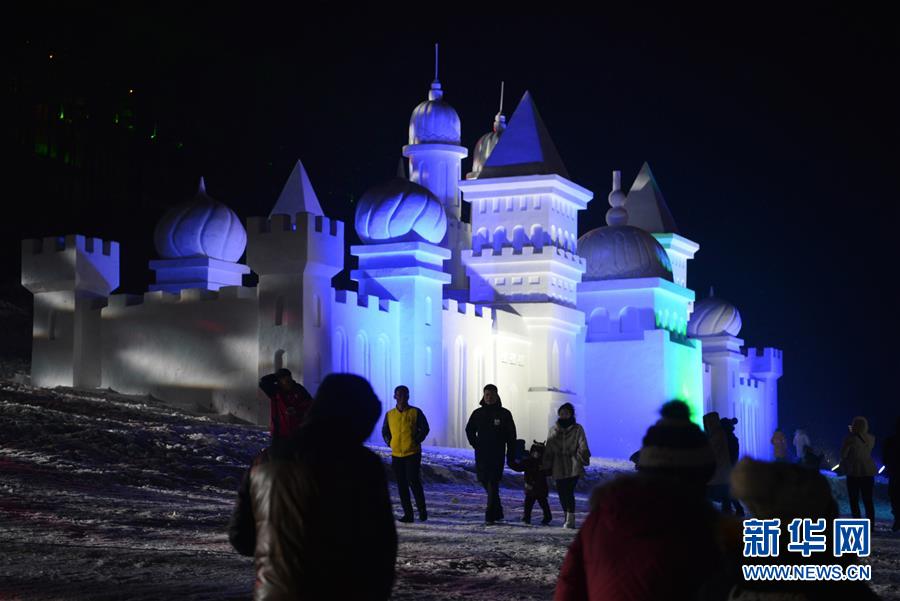 12月21日,游客在冰雪節(jié)開(kāi)幕式上走過(guò)雪雕城堡。新華社記者鄒予攝