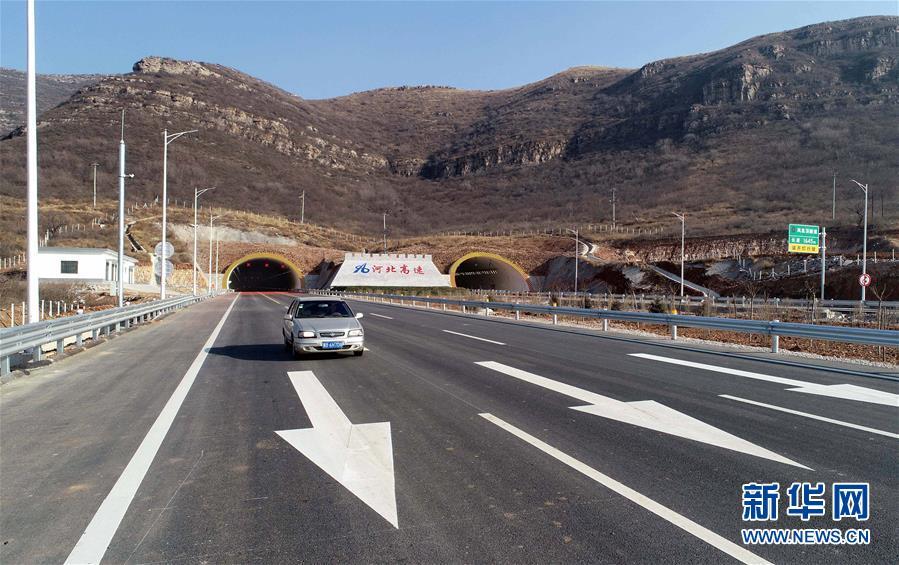 12月16日,一輛汽車行駛在京秦高速公路二期工程河北玉田境內的鳳凰頂隧道路段(無人機拍攝)。