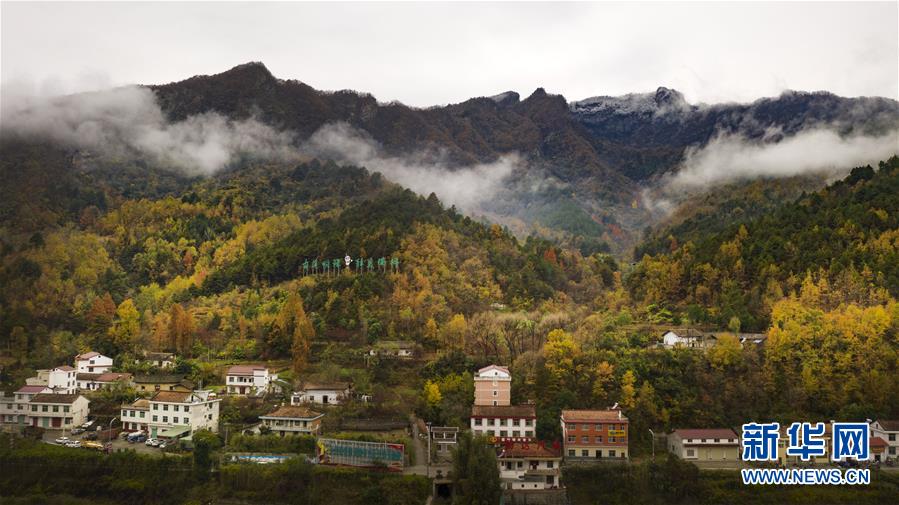 云霧中的鬼谷嶺國家森林公園山頂白雪皚皚,山腰秋色正濃(11月8日無人機(jī)拍攝)。 新華社記者陶明攝