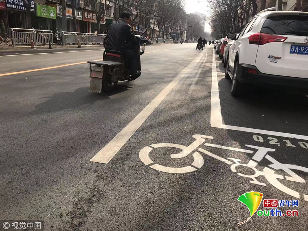 12月25日報道,12月24日,鄭州市文化宮路有市民反映,新鋪好的文化宮路非機動車道被剛劃的“停車位”擠得只有0.8米寬。原本2米多寬的非機動車突然有汽車停放后,騎車經(jīng)過的行人只得被逼進快車道通行,很不安全。