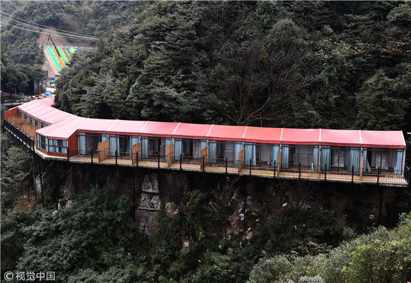 2017年11月16日,重慶萬(wàn)盛一景區(qū)內(nèi)的臨崖酒店依山而建,色彩絢麗如山間彩虹。據(jù)介紹,該酒店位于當(dāng)?shù)貖W陶紀(jì)景區(qū)內(nèi),酒店順著山形而建盤旋在山間,特別顯眼。 周毅(重慶分社)/中新社/視覺(jué)中國(guó)