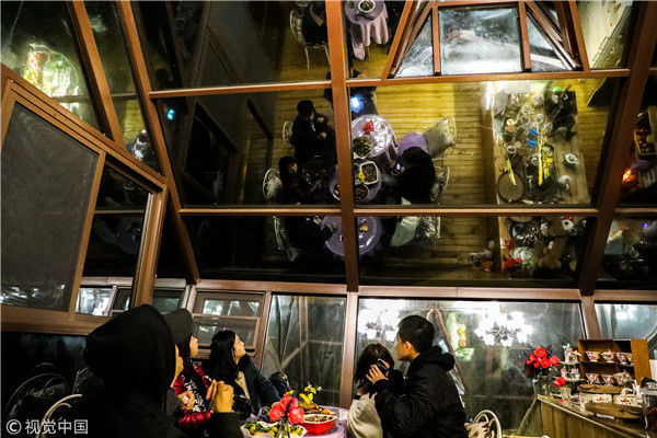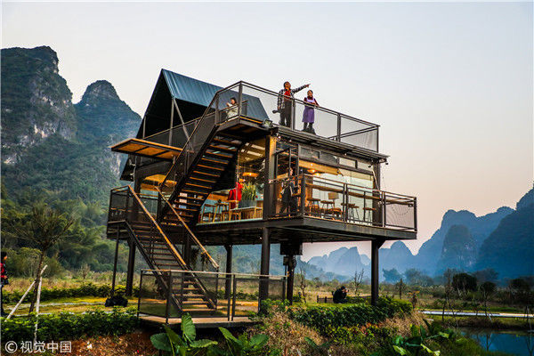 2018年12月17日,廣西桂林,陽(yáng)朔縣遇龍河畔。黃昏時(shí)分,游客站在觀景臺(tái)觀賞泡泡屋及周邊景觀。