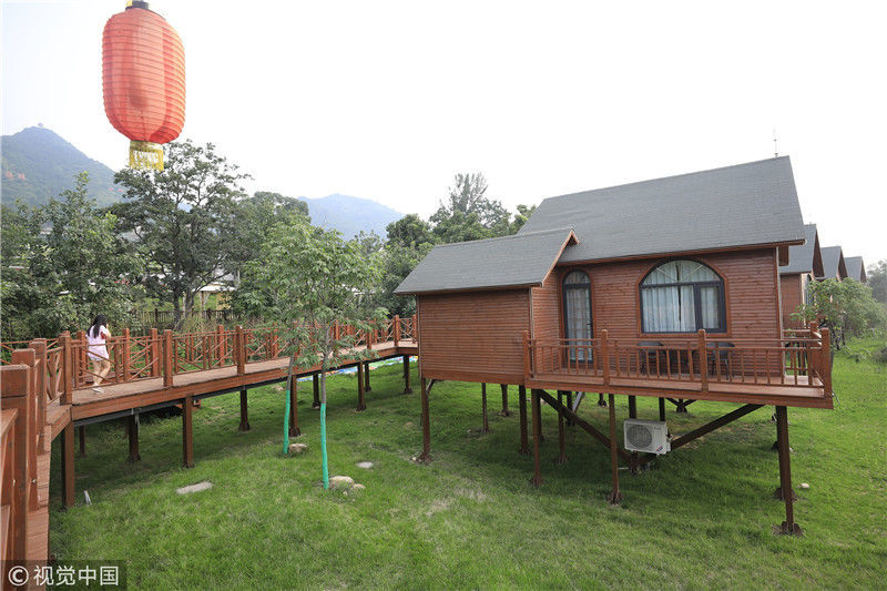 2018年7月6日,航拍陜西渭南臨渭區(qū)天留山下的小木屋民俗酒店。王警/視覺(jué)中國(guó)