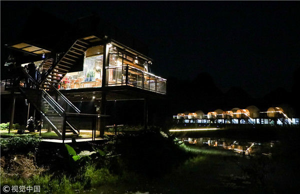2018年12月17日,廣西桂林,陽(yáng)朔縣遇龍河畔。夜色中的泡泡屋。