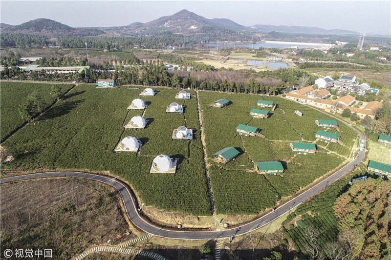 2018年12月18日,江蘇常州金壇茅山百畝茶田中的帳篷酒店和泡泡屋美不勝收。這里打造的帳篷,泡泡屋極具特色,可以讓游客與大自然零距離接觸,這種形式的“酒店”十分撩人,深受歡迎。韓加君/視覺(jué)中國(guó)