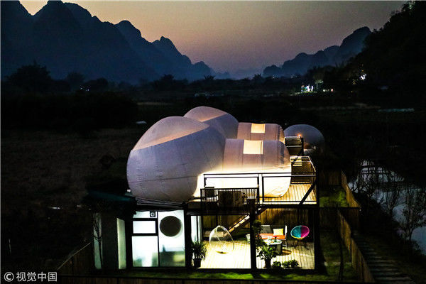 “泡泡屋”列陣陽(yáng)朔河畔 游客可躺在床上看星星