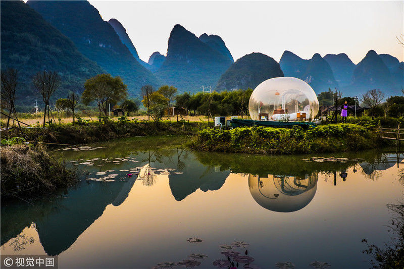 最近這幾年,中國(guó)的民宿風(fēng)越刮越猛,各地精品民宿紛紛如雨后春筍一樣冒出了,而且他們用其更獨(dú)特的設(shè)計(jì)感吸引著人們的目光。其實(shí)對(duì)比星級(jí)酒店,民宿最大的優(yōu)勢(shì),就是設(shè)計(jì)風(fēng)格更獨(dú)特,更具藝術(shù)感,也更符合人們的審美要求,同時(shí)又能做到比星級(jí)酒店更舒適,更適合度假,所以大家現(xiàn)在出行都更熱衷于選擇民宿。圖為2018年12月18日,廣西桂林,陽(yáng)朔縣遇龍河畔。晨光中的泡泡屋。棋簿紫/視覺(jué)中國(guó)