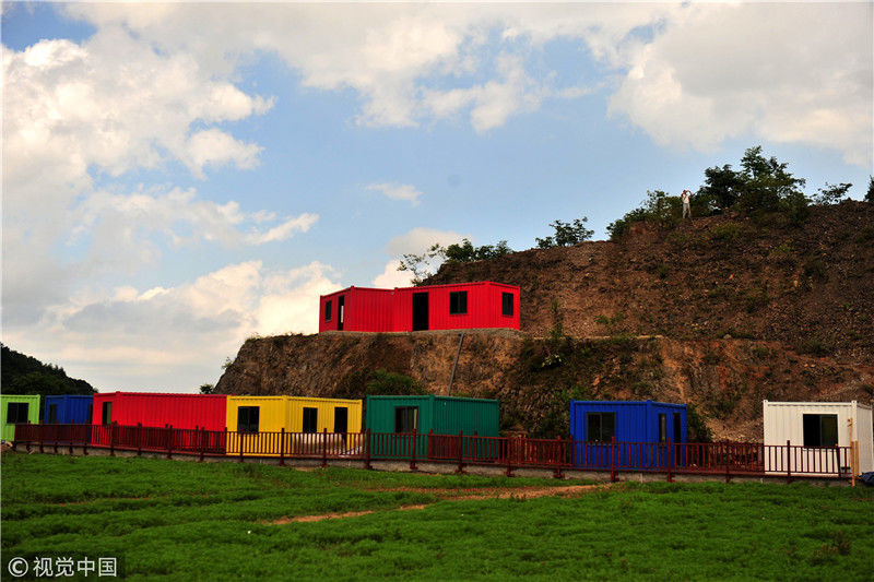 2018年6月9日,湖北省宜昌市夷陵區(qū)樟村坪鎮(zhèn)羊角山村“云上西寨”康養(yǎng)綠地正在建設的“集裝箱”民俗項目區(qū)風景。張國榮/視覺中國