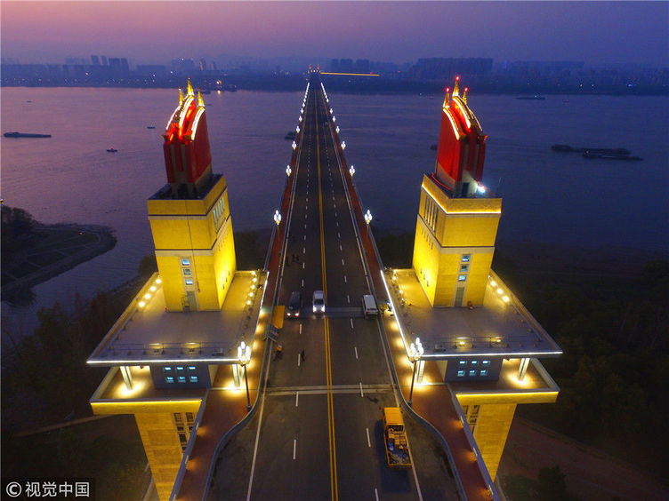2018年12月13日,江蘇南京,“一橋飛架南北,天塹變通途?!弊鳛槲覈?guó)第一座自行設(shè)計(jì)和建造的雙層鐵路、公路兩用橋,南京長(zhǎng)江大橋在我國(guó)橋梁史上的重要地位不言而喻。從1968年建成后的48年間,它就如同一條巨龍,始終在長(zhǎng)江上默默守護(hù)著人來(lái)車往。南京長(zhǎng)江大橋上層是公路橋,下層為雙軌復(fù)線鐵路橋,連接津浦鐵路與滬寧鐵路干線,是我國(guó)南北交通要津和命脈。近年來(lái),由于南京長(zhǎng)江大橋公路橋的實(shí)際通行荷載遠(yuǎn)超原先設(shè)計(jì)標(biāo)準(zhǔn),不僅橋面上擁堵常現(xiàn),橋梁本身的種種“病害”也日益加深。圖為2018年12月13日,夜幕降臨,南京長(zhǎng)江大橋歸位后的玉蘭花燈重新點(diǎn)亮。大橋玉蘭花燈柱共有299根,每根燈柱上有5盞玉蘭花燈,1大4小,一共1495盞。方東旭/視覺(jué)中國(guó)