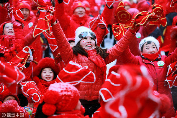 2017年12月31日,黑龍江黑河。近萬民黑河市民和數(shù)十名俄羅斯游客,身穿“中國紅”在中央街跳起熱舞迎接新年。