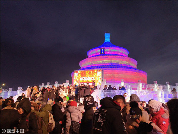 2017年12月31日,哈爾濱冰雪大世界亮燈迎新年,吸引大批游客跨年游玩。